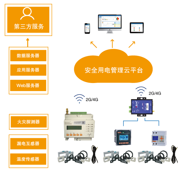 2. 用電安全監測系統:建立城市級用電安全監控平臺,對引起電氣火災的主要因素(線纜溫度、電流、電壓、剩余電流)進行實時在線監測和統計分析,及時掌握線路存在的用電安全隱患狀態。可通過手機 APP、PC 端向用戶發送隱患告警信息及用電安全報告。實現工作人員 24 小時后臺功能,緊急情況調取設備信息和報警信息,并自動顯示單位負責人聯系方式;通過手機端軟件,用戶可以隨時隨地查詢自己企業的用電情況;對單位用電安全情況自動生成周報,實現單位用電情況的全面分析,并提供用電問題危害和整改措施;生成本地區用電安全大數據,便于監管部門掌握本地區安全用電形式。